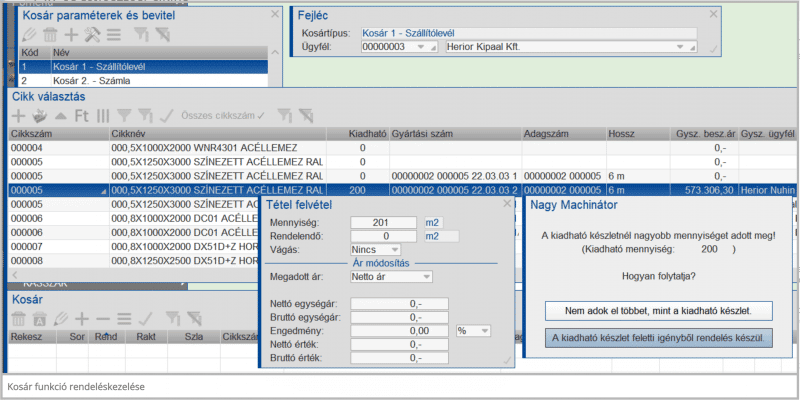 A Kosár funkcióban elérhető, hogy a kosárba rakás során a felhasználó kérhesse, hogy a rendelkezésre nem álló készletből rendelést vegyen fel a program.