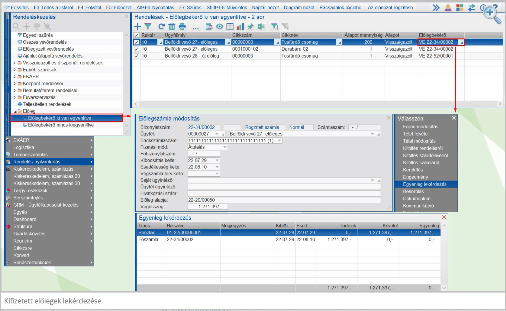 – Előlegkifizetésére váró és a már kifizetett vevőrendelések lekérdezése.