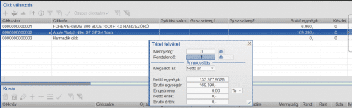 A kosár alapműködése szerint a gyártási számos termékek gyártási számonként jelennek meg a cikkválasztó ablakban.