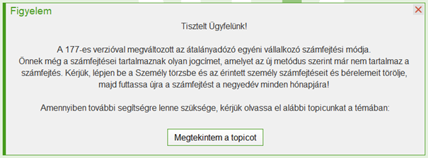 Amennyiben átalányadózó egyéni vállalkozót számfejtenek, mindenképpen szükséges a program legalább 177-es verzióra való frissítése.