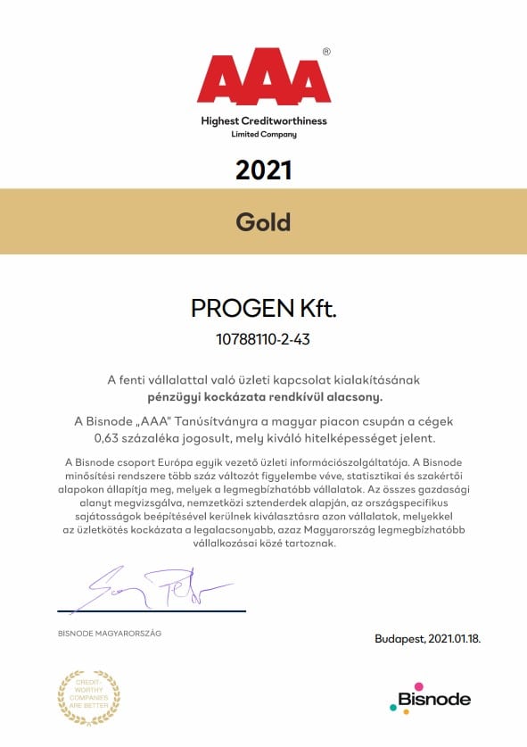 A Progen Kft. 2021-ben is megkapta a Bisnode AAA (tripla A) tanúsítványát, mellyel a hazai vállalkozások mindössze 0,63 %-a rendelkezik.