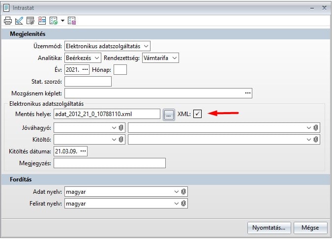 Megvalósítottuk az Intrastat adatszolgáltatás XML formátumban történő exportálását. 2021-től a KSH XML formátumban várja el az adatszolgáltatások benyújtását felhasználóinktól. Amennyiben 2021-es adatszolgáltatást szeretnének készíteni, abban az esetben automatikusan egy XML fájl fog elkészülni a megadott mentési könyvtárba. Amennyiben 2021 előtti adatszolgáltatást szeretnének készíteni, egy pipa segítségével tetszőlegesen szabályozható, hogy milyen formátumban készüljön el a fájl.