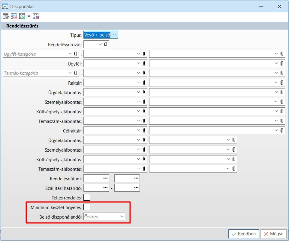 A rendelésnyilvántartás bizonylat bevitelekben ismert Diszponálás művelet is bővült a Diszponálás funkcióban említett Minimum készlet figyelés és Belső diszponálandó mezővel.