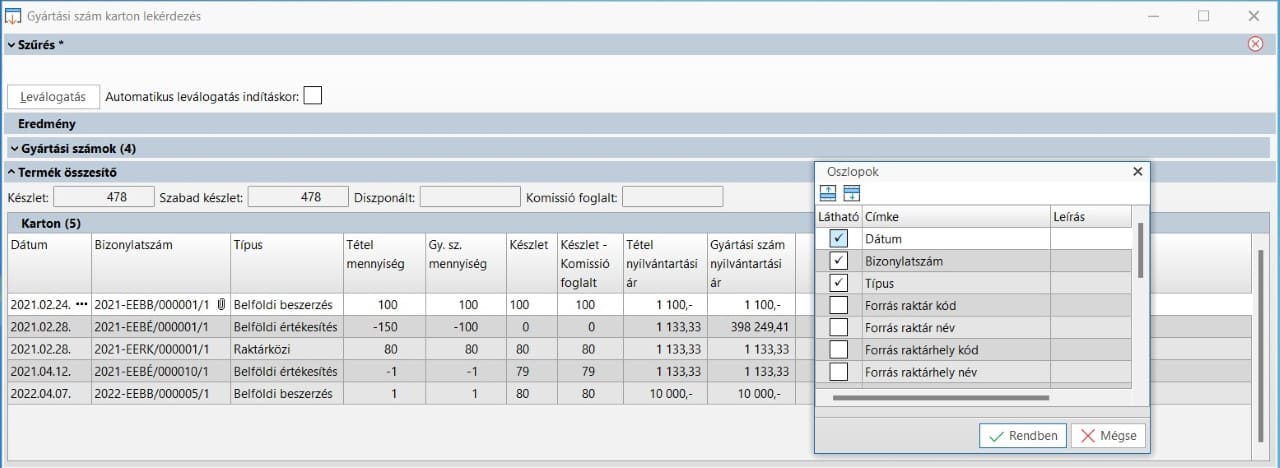 A funkció Termék összesítő sáv, Karton gridje ad tájékoztatás arról, hogy a kiválasztott gyártási szám, milyen szállítóleveleken mozgott a múltban. Raktárközi szállítólevelek esetén a mozgásnak csak az a lába látszott, ami az adott raktár készletét érintette, ezért nem volt információ arról, hogy adott esetben melyik raktárból / alábontásból jött a készletnövelő-, vagy hová távozott a készletcsökkentő mennyiség. Azért, hogy ez átláthatóbbá váljon, és könnyebb legyen a készletmozgás előzmények nyomozása, néhány plusz oszlopot fejlesztettünk, amelyek csak a jobb gomb/Oszlopok ponton kapcsolhatóak be. Új oszlop pl.: Forrás/Cél raktár kód és név, Raktárhely kód és név, Alábontások.