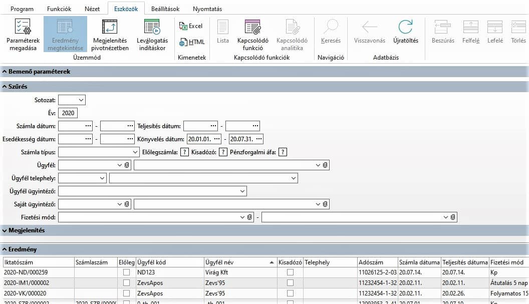 Új „Szállító számlaösszesítő tételes lekérdezést” fejlesztettünk az új eredményhalmaz lekérdezés segítségével. Az eredményben az adatok megegyeznek a számlaösszesítő termékenkénti listával.