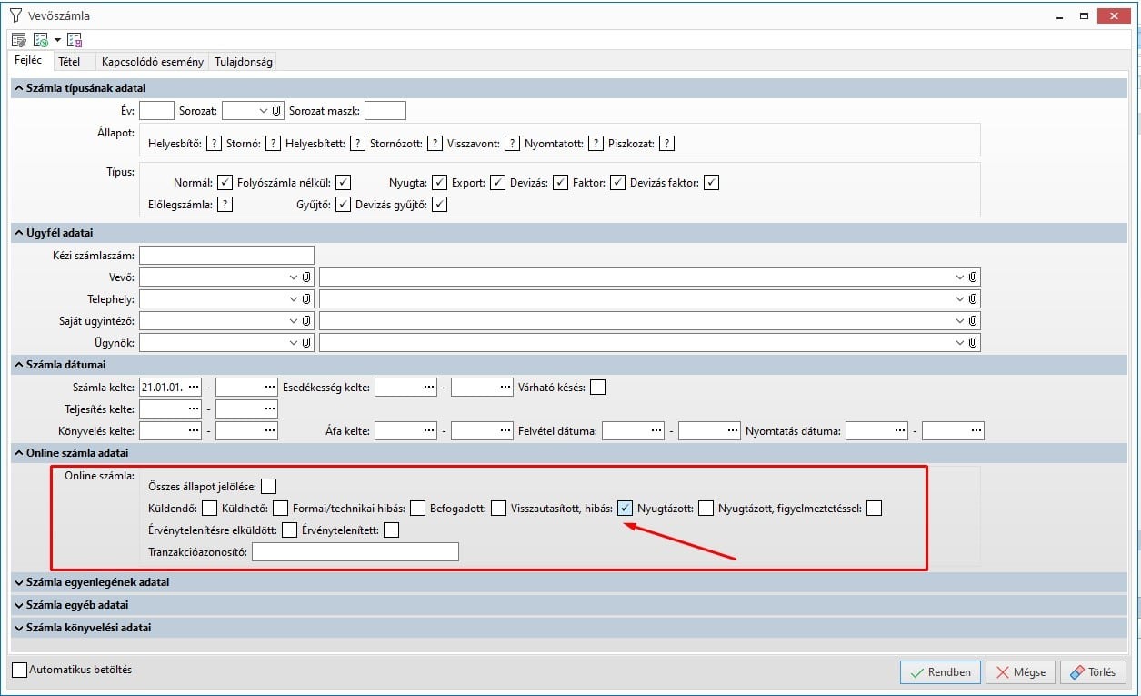 Emellett a vevőszámla funkcióban is könnyedén rá tudnak szűrni a számlák Online számla állapotára.