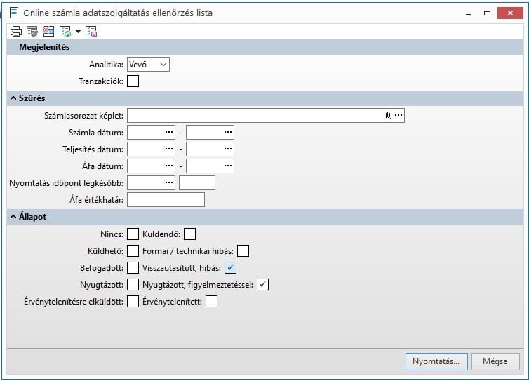 Az ellenőrzések elvégzéséhez a sERPa Alap \ Pénzügy \ Vevő \ Listák \ További listázási lehetőségek \ Online számla adatszolgáltatás ellenőrzés lista használható, mely automatikus üzenetben is elküldhető az érintett felhasználónak.