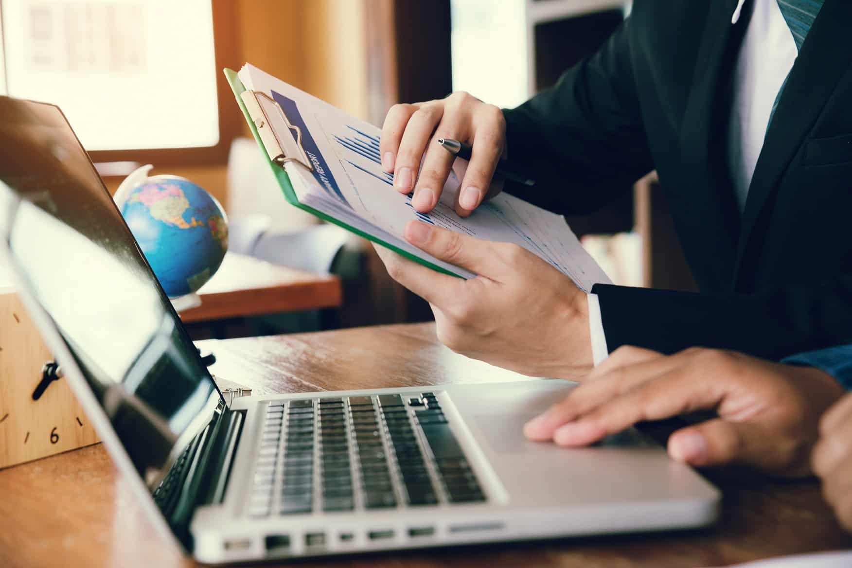 Business man hand holding graph chart and pointing graph chart for analyze the company’s sales plan in the office.